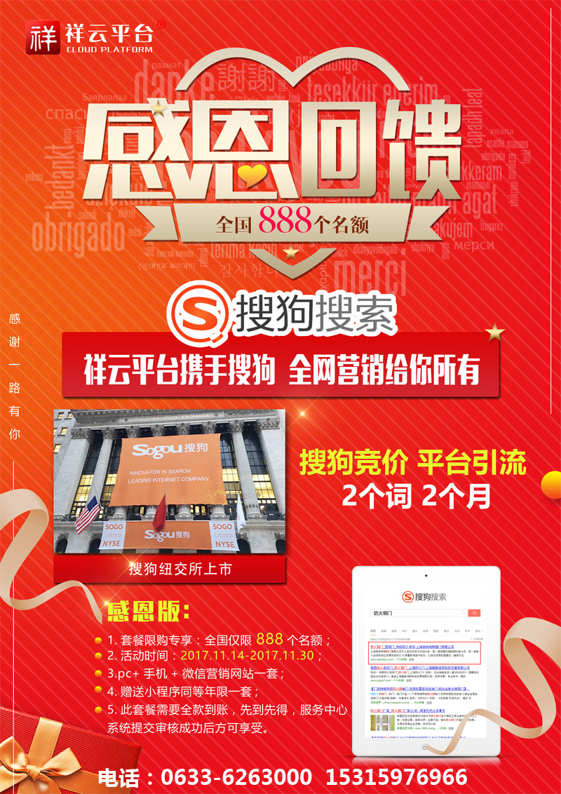 2017年11月9日,搜狗在紐交所上市,成為國內(nèi)第二大搜索引擎,祥云聯(lián)合搜狗,推出2017感恩鉅惠活動:凡簽約祥云營銷型網(wǎng)站,即送搜狗競價關(guān)鍵詞,兩個詞,兩個月!名額有限,先到先得!電話:0633-6263000 15315976966